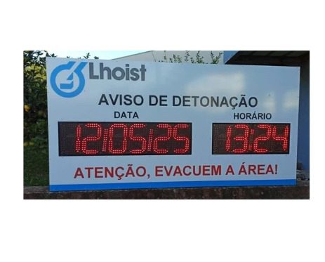 Equipamento de sinalização de segurança visual e sonora, projetado especificamente para alertar sobre horários de desmonte em áreas industriais ou de mineração. O painel é robusto e totalmente adaptável às necessidades do local.